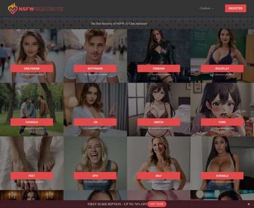 El sitio cuenta con una plétora de categorías entre las que los usuarios pueden elegir, como azotes, BDSM, giganta, inflación, hipnosis, romántico, castidad, futanari, waifu, gooning, mariquita, esclavo, lesbiana, peludo, ballbusting, teléfono, pies, SPH, MILF, shemale, juegos de rol, novia, novio, femdom, cornudo, JOI, hentai, vore y muchas más. Para empezar, tendrás que registrarte y crear una cuenta. Con la cuenta, podrás navegar por los miles de chatbots de diferentes categorías y empezar a interactuar libremente como si estuvieras haciendo sexting con un humano real