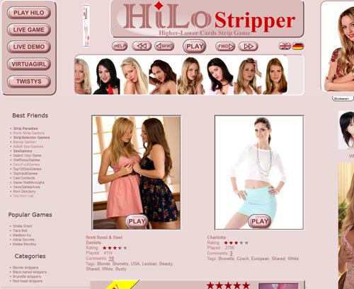 HiloStripper.com es un sitio web para adultos donde se juega a un juego de cartas: juego de tiras de cartas más altas y más bajas. Yo no sabía lo que es, pero este sitio web me dio una demostración en vivo para ver, con el fin de entender lo que significa exactamente este juego. Y fue pan comido aprenderlo. Bienvenido a HiloStripper, un muy buen sitio para adultos donde podrás divertirte con chicas reales. Te dejarán elegir entre el inglés y el alemán, dependiendo de tus conocimientos.