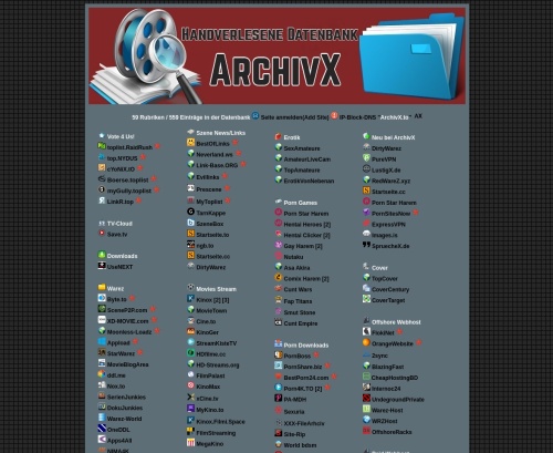 ArchivX on hyödyllinen linkkisivusto, josta löydät suosituksia kaikkeen, mitä tarvitset verkossa. Miksi siis esittelemme tätä alustaa sivustollamme? No, koska suurin osa verkossa tarvitsemistamme asioista on pornoa. Ja siksi ArchivX:llä on paljon hyödyllisiä pornolinkkejä, jotka on järjestetty hyvin kategorioihin. Saat kyllä suosituksia valtavirtapornoverkkoihin ja ilmaisiin putkiin. Mutta saat myös siistin valikoiman linkkejä erotiikkasivustoille, todellisiin amatööripornosivustoihin ja jopa pornokuviin, joissa kirjastot ovat tarpeeksi kuumia saadakseen sinut laukeamaan. Rakastamme myös seksipelien suosituslistaa. Useimpia tällä alustalla suositelluista seksipeleistä voi pelata suoraan selaimessasi ilman rekisteröitymistä tai lataamista.Haluatko perustaa oman pornosivuston ja sinun on ladattava isoja sisältöpaketteja ilmaiseksi? Sinulla on luettelo torrent-sivustoista, joista voit hankkia kaikenlaista pornoa. Mutta myös muut kuin aikuisten suositukset ovat hyödyllisiä. Löydät anime-suoratoistosivustoja, elokuvien suoratoistosivustoja ja jopa joitakin sivustoja, joilla voit suoratoistaa suoria televisiokanavia.