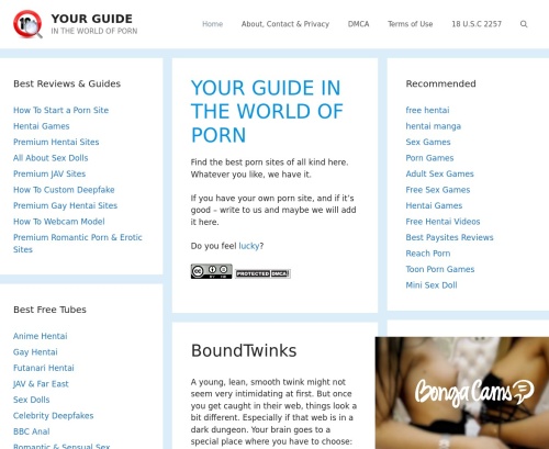 PornGuide on yksinkertainen pornosivusto, joka erottuu siistillä, helppokäyttöisellä ulkoasullaan ja käyttäjäystävällisellä käyttöliittymällään. Otsikon yläosassa olevan hakukentän ja kätevien tunnisteiden avulla käyttäjät voivat löytää tiettyjä oppaita ja XXX-sivustojen arvosteluja vaivattomasti. Luokkia on runsaasti, ja ne tarjoavat laajan valikoiman XXX-nichejä ja fetissejä, jotka täyttävät jokaisen maun. Erityisosiot suositelluille, parhaille arvosteluille, parhaille oppaille, XXX-kategorioille ja jopa parhaille ilmaisille putkille tarjoavat käyttäjille lisää sitoutumista.