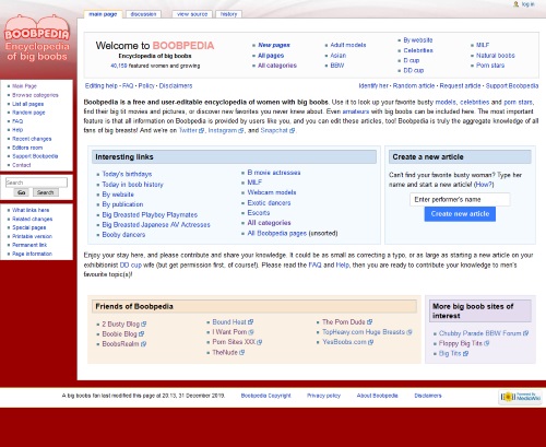 Вы знаете, что мы страстно любим порно, и именно поэтому мы рассматриваем и рекомендуем не только порносайты. Мы также рекомендуем платформы, на которых вы можете узнать больше о ваших любимых порнозвездах и продюсерах. Одна из самых надежных платформ в мире порно - Boobpedia. Я не могу не поблагодарить их за то, что они много раз помогали мне в поисках порнообзоров и статей о порнозвездах. Boobpedia для порно - это то же самое, что Википедия для науки. У нее даже интерфейс такой же, что облегчает просмотр благодаря знакомому оформлению. В этой огромной базе данных собрана ошеломляющая коллекция биографических статей о девушках с большими сиськами. На момент написания этого обзора в базе данных содержались биографии 40 159 порнозвезд, но коллекция пополняется каждую неделю, и в ней появляются новые записи со всего мира. Помимо всех грудастых американских порнозвезд, представленных на сайте, вы также найдете красивые биографии японских AV-идолов. Что самое интересное в Boobpedia, так это то, что база данных редактируется пользователями. Таким образом, вы можете включить в список любую грудастую малышку, даже любительниц позировать голышом.