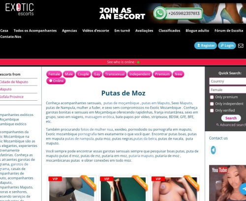 Познакомьтесь с горячими, сексуальными и красивыми мозамбикскими эскортницами на ExoticMozambique - сайте, который дает вам возможность один раз в жизни встретиться и потрахаться с настоящими африканскими малышками из южной части Африки. Эти эскортницы - истинное определение черной красоты. Они роскошны, великолепны и очень милы. Вам не придется объезжать всю страну Мозамбик, чтобы найти эскорт, который отвечает всем требованиям. Достаточно зайти на сайт ExoticMozambique, чтобы получить женщину, с которой можно поговорить, погулять, поиграть и, самое главное, потрахаться. Мозамбикские эскортницы просто великолепны, и они представляют все сексуальные ориентации. Это означает, что независимо от того, являетесь ли вы лесбиянкой, транссексуалом, гетеросексуалом, бисексуалом, геем или интерсексуалом, вы всегда найдете эскорт, ожидающий вашего внимания.