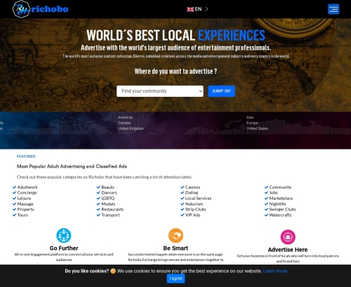 Richobo är en populär vuxenannonsering och klassificerad annonswebbplats som erbjuder en allt-i-ett engagemangsplattform för vuxna över hela världen för att ansluta och hitta de bästa tjänsterna. Webbplatsen är också en underhållningsrådgivare där du hittar alla de bästa underhållningsplatserna, vuxenshower, fina restauranger, boende, vuxna underhållare, lokala anslutningar, tjänsteleverantörer, evenemang, budgettips, personliga annonser, nattliv, en vuxen guide, populära eskortplatser och recensioner, en karta reseresurs och mer. Du hittar kontaktuppgifter, foton och adresser till alla de bästa platserna och tjänsteleverantörerna du behöver. Webbplatsen täcker de flesta delar av Europa, Australien, Afrika, Nordamerika, Asien, Sydamerika och det stora Storbritannien.
